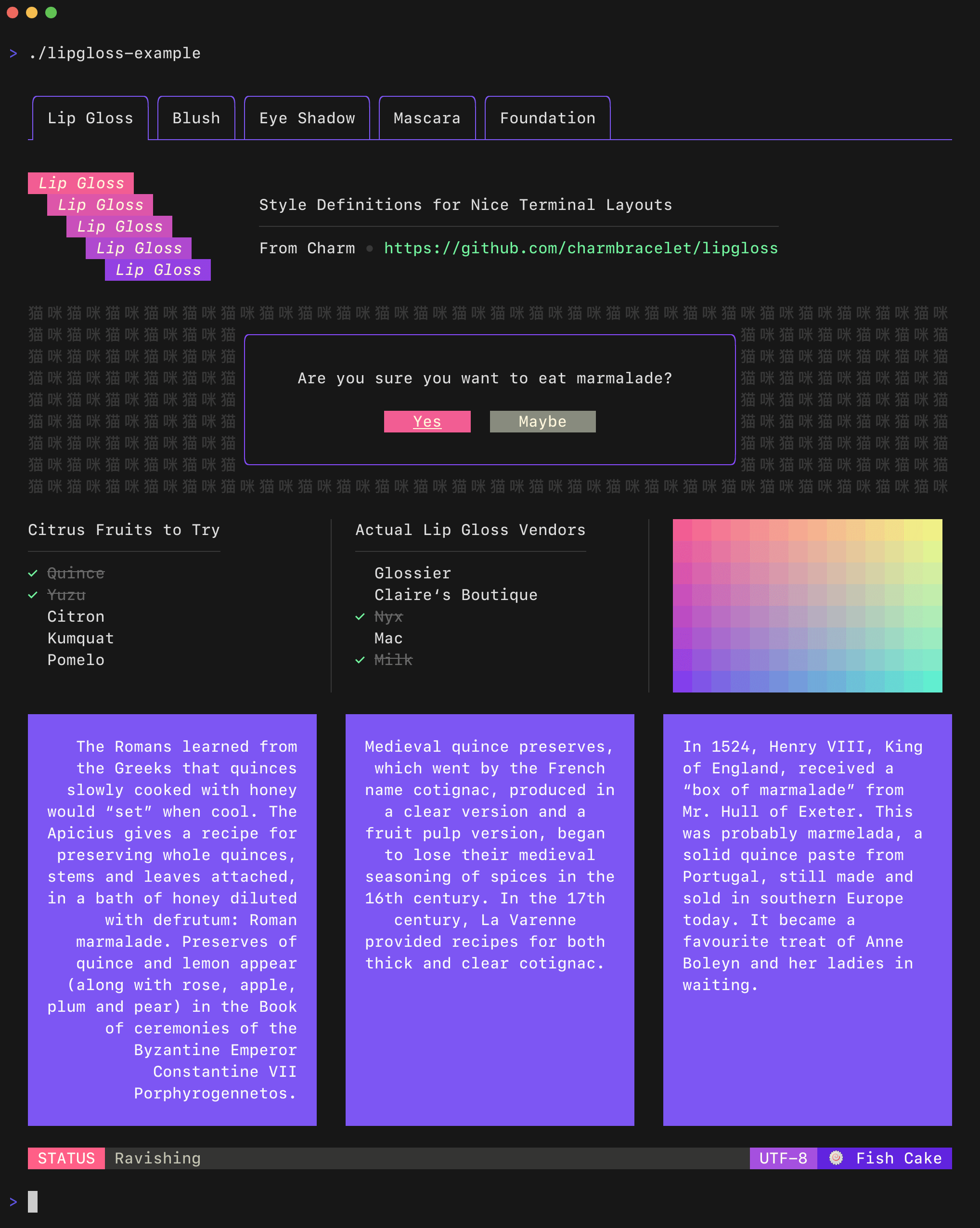Lip Gloss: TUI 的样式、格式、布局相关的工具库,非常强大!! 且好看: